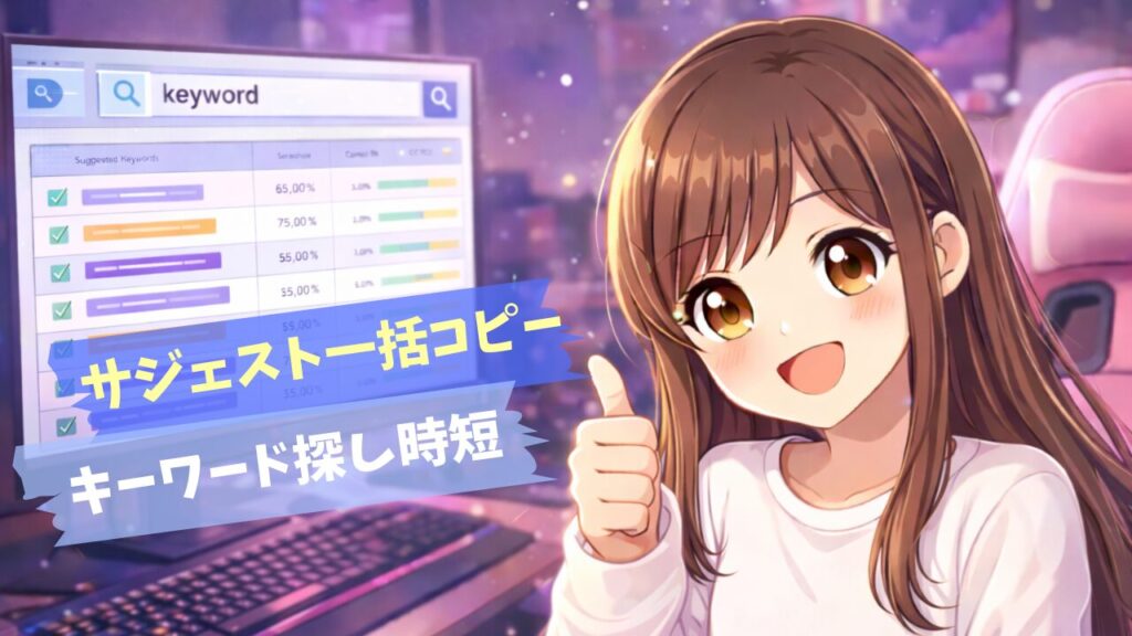 ブログのキーワード探しで地味にしんどいのが、これ。 Googleのサジェストに出てきたキーワードを 1個ずつメモ帳にコピペして…また検索して…また手打ちして… これ、やってると「キーワード探しだけで疲れる」んですよね。 そこで今回は、私が普段やってい...
