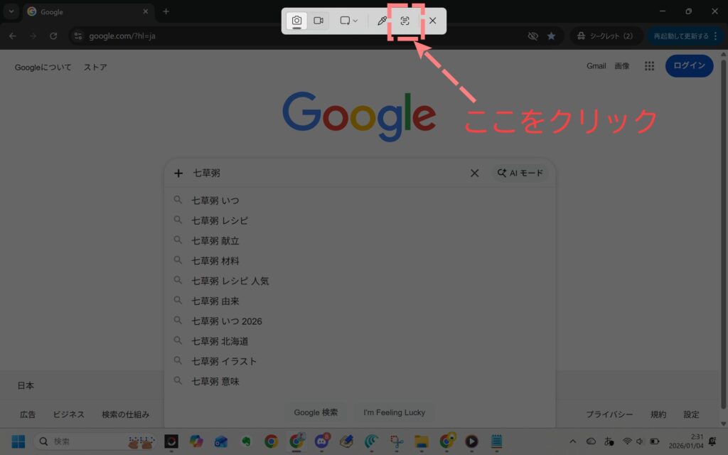 Google検索結果で表示された「サジェスト部分」だけをマウスで囲みます。