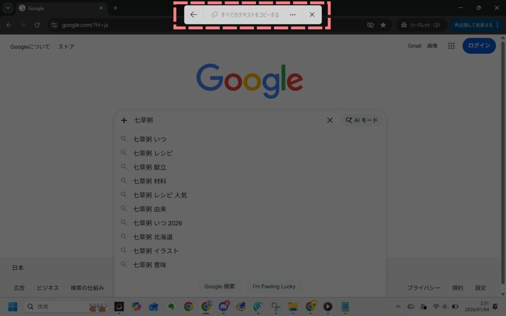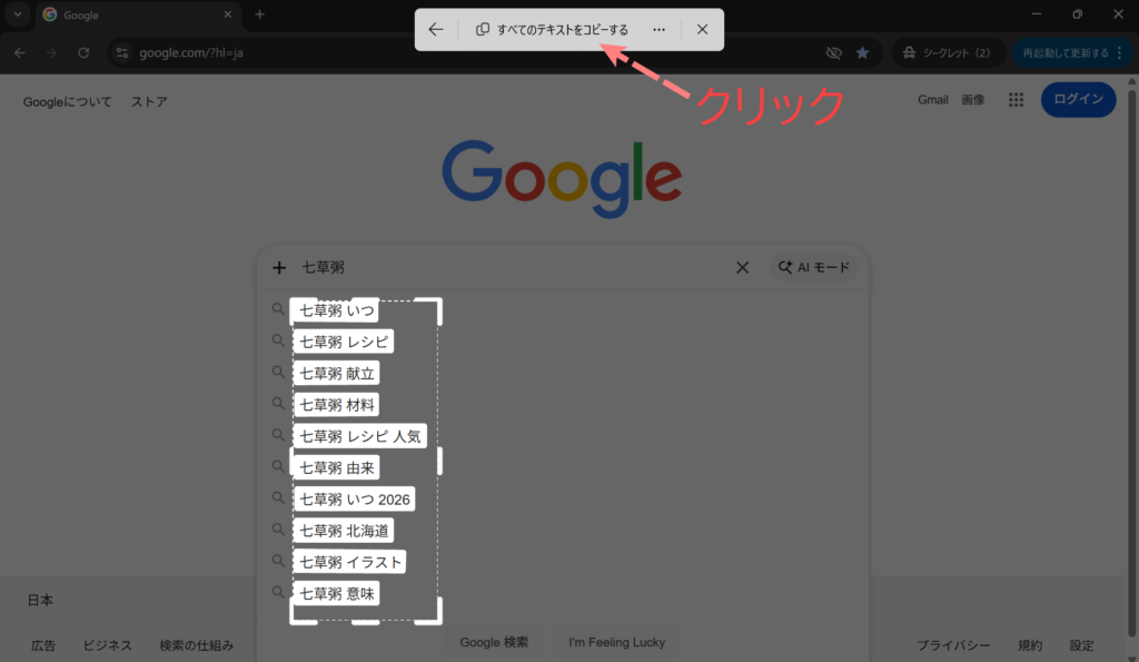 クリックすると「すべてのテキストをコピーする」と表示されます。